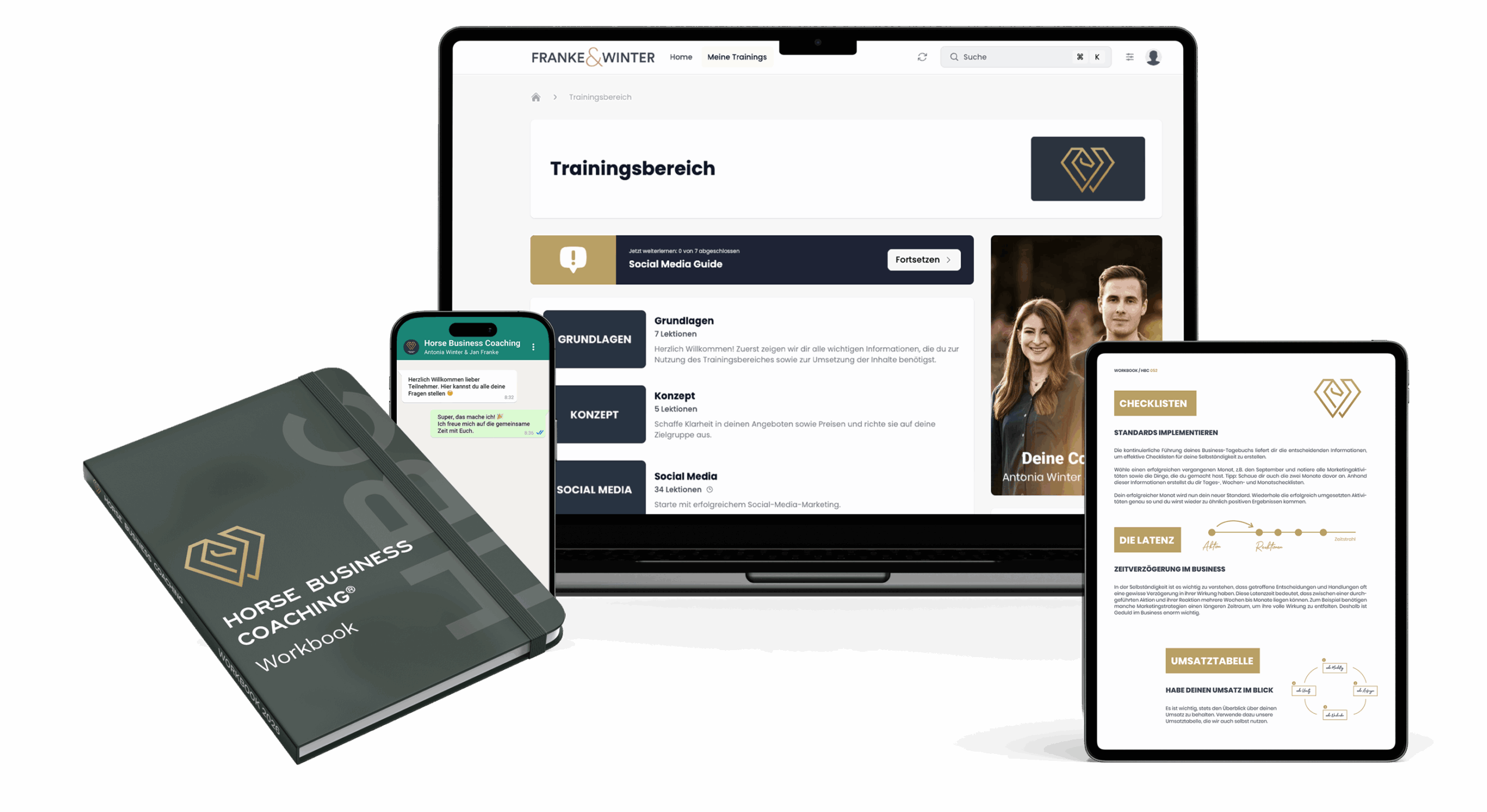 Zusätzlich bekommst du Zugriff auf unser erprobtes System aus über 7 Jahren Zusammenarbeit mit Selbständigen aus der Pferdebranche. Dazu gehören Trainings, Checklisten, Vorlagen und klare Schritt-für- Schritt Anleitungen für die wichtigsten Bereiche deines Unternehmens.